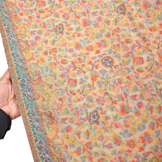 Indian Vintage Beige Pure Woolen Shawl Handmade Woven Work Long Throw Stole Warm Floral Design Soft
