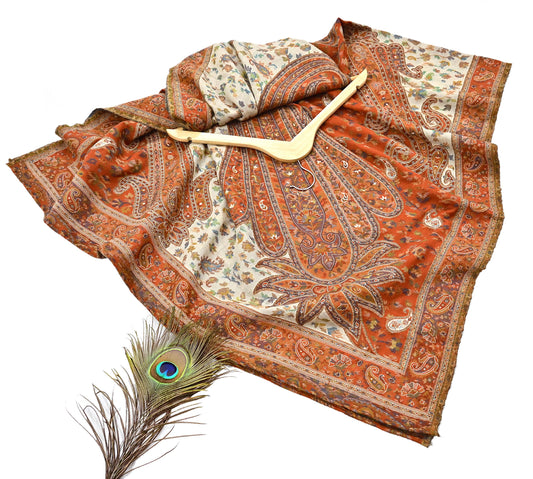 Indian Vintage Cream & Orange Pure Woolen Shawl Handmade Woven Jamawar Work Long Throw Stole Warm Paisley Design Soft