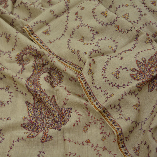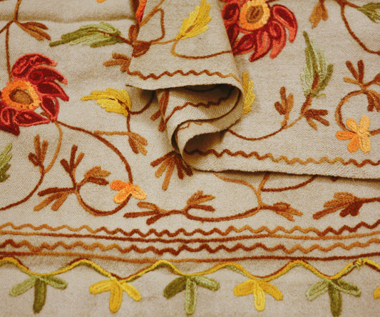 Vintage Pure Woolen Shawl Handmade Ari work Long Throw Stole Warm Stole Beige Floral Design