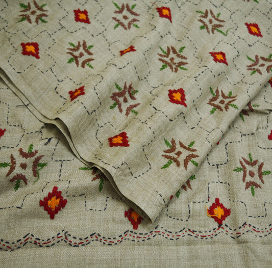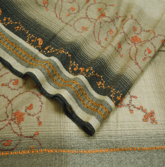 Vintage Gray Pure Woolen Shawl Handmade Embroidered Kantha Long Throw Stole Warm Stole ivory Floral Design