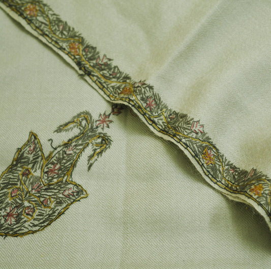 Vintage Shawl Ivory Pure Woolen Handmade Suzani Long Throw Stole Warm Stole Floral Design Fringes