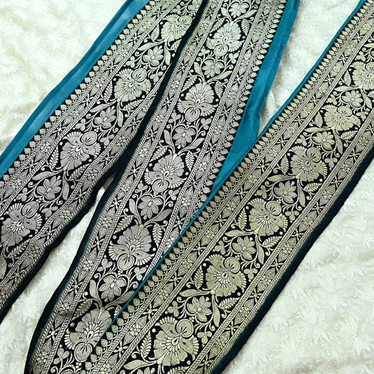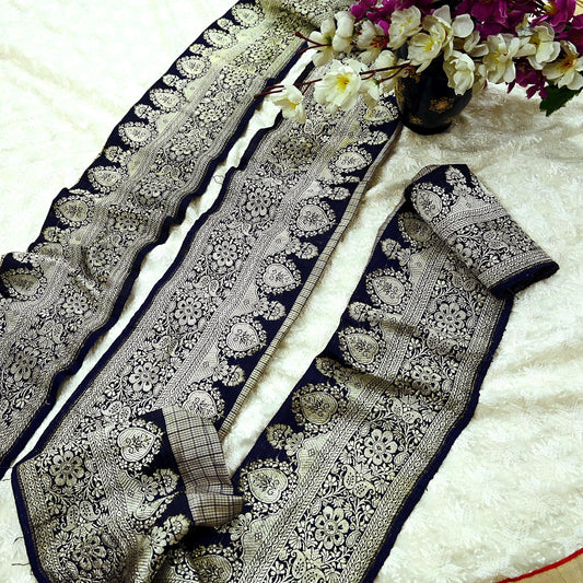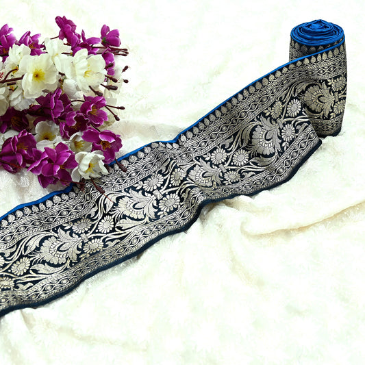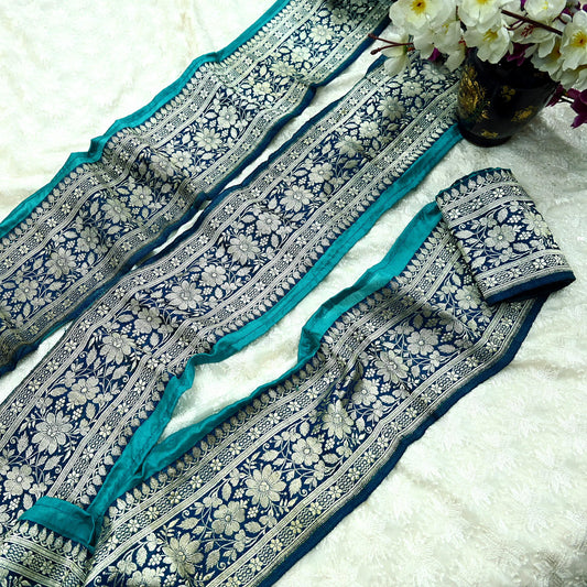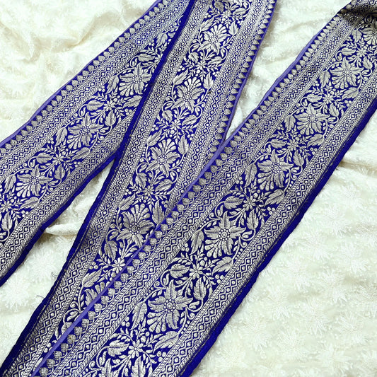 Indian Vintage Blue Sari Border Woven Banarasi 1yd Trim Craft Sewing Recycled Sari Border Silver Zari Pure Silk Home Decor Crafting