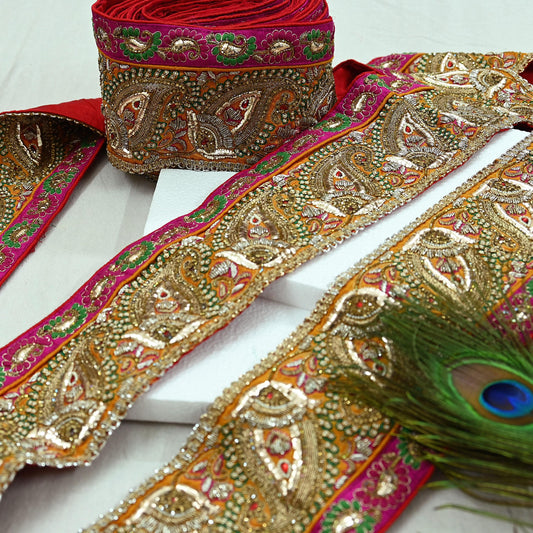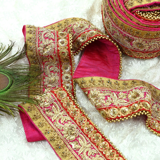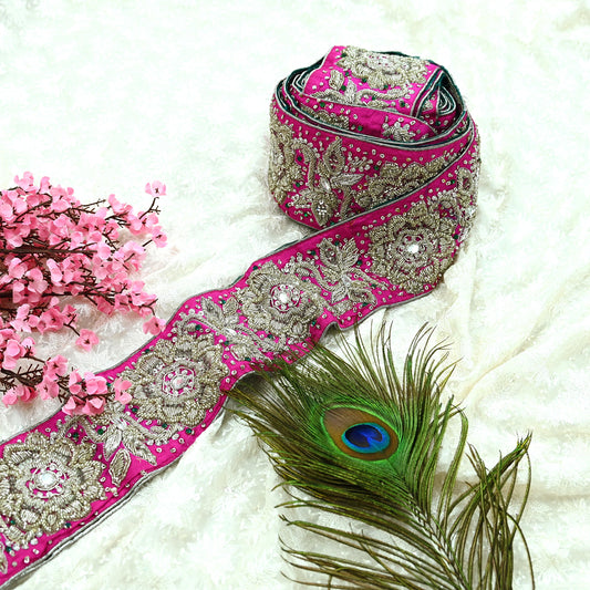 Indian Vintage Sari Border Magenta Hand Embroidered Craft Trim Lace 1Yd Sewing Sari Ribbon Dress making Dress Designing Decor Dabka