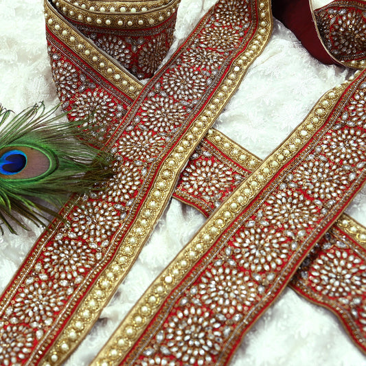 Indian Vintage Sari Border Red Hand Embroidered Craft Trim Lace 1Yd Sewing Sari Ribbon Dress making Dress Designing Decor Dabka