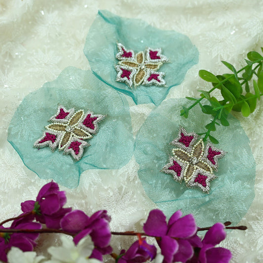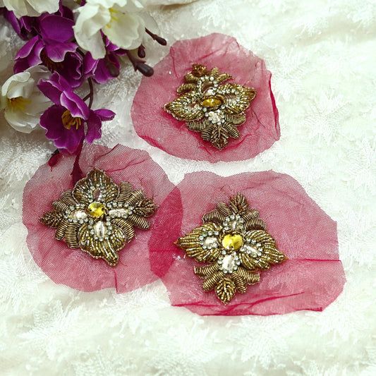 Indian Vintage Pink Net Hand-Embroidered Appliques Set of 3, Zardozi, Dabka, Mukesh, Bead Work | Floral Patches for Crafts, Journals