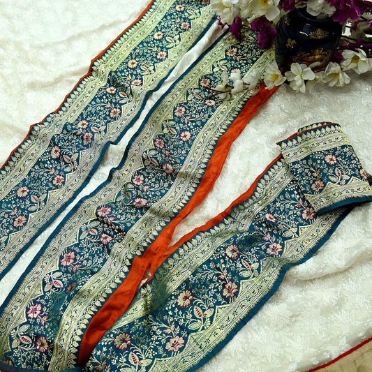 Indian Vintage Blue Sari Border Woven Banarasi 1yd Trim Craft Sewing Recycled Sari Border Golden Zari Pure Silk Home Decor Crafting