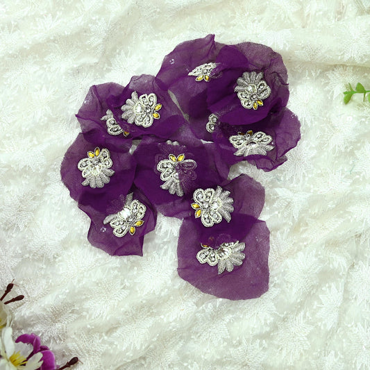Indian Vintage Purple Pure Georgette Silk Appliques Set of 5 | Hand-Embroidered Floral Patches with Zardozi, Dabka, for Craft, Journals