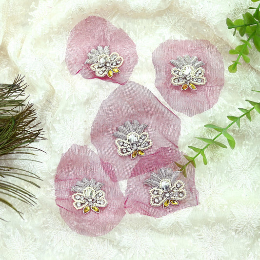 Indian Vintage Pink Net Hand-Embroidered Appliques Set of 5, Zardozi, Dabka, Mukesh, Bead Work | Floral Patches for Crafts, Journals