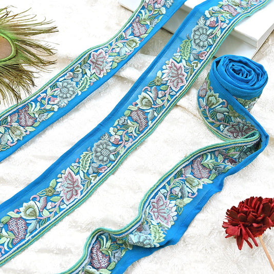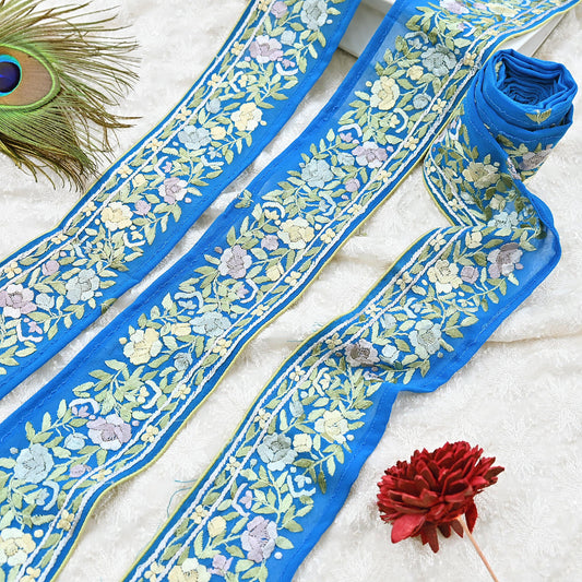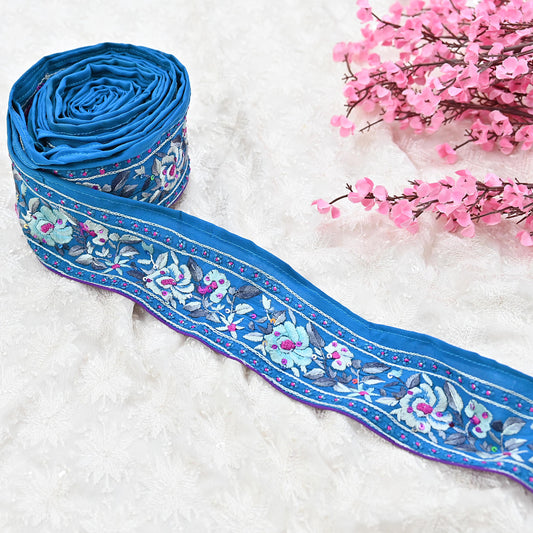 Indian Vintage Blue Border Hand Embroidered Craft Trim Lace Sewing Sari Ribbon Crepe Zari Mirror Decor Gift Wrapped Paisley