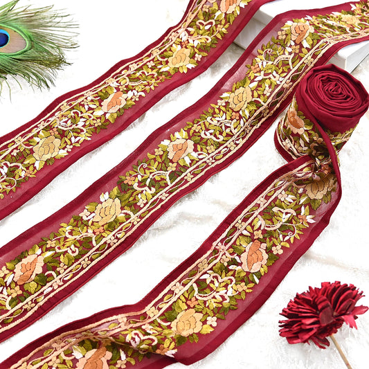 Indian Antique Vintage Real Parsi Gara Border Red Hand Embroidered Craft Trim Lace Sewing Saree Ribbon Recycled 1yard Pure Georgette Silk