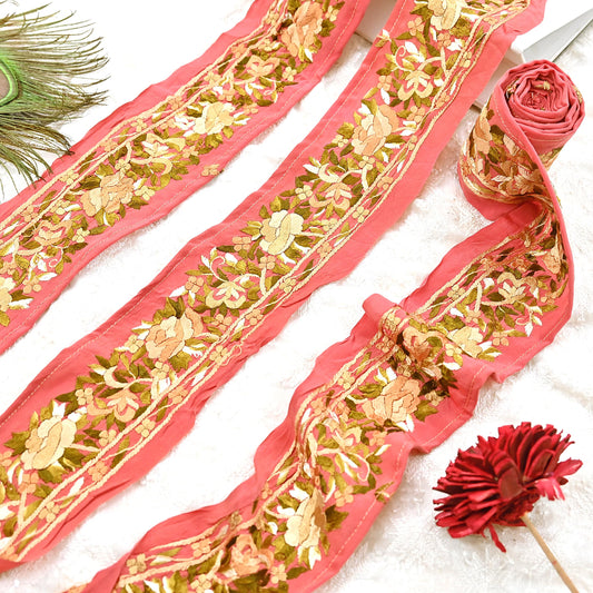 Indian Vintage Peach Sari Border Hand Embroidered Craft Trim Lace Sewing Pure Georgette Silk Ribbon Recycled Zardozi