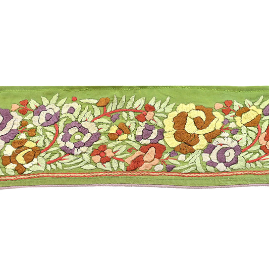 Indian Vintage Green Border Pure Crepe Silk Hand Embroidered Indian Craft Trim Lace Sewing Sari Ribbon Recycled Decor Gift Wrapped