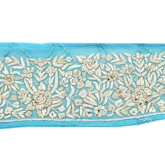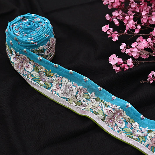 Indian Vintage Real Parsi Gara Border Turquoise Hand Embroidered Craft Trim Lace Sewing Saree Ribbon Recycled 1yard Pure Georgette Silk