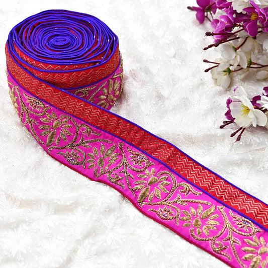 Indian Vintage Magenta Sari Border 1Yd Hand Embroidered Dabka Lace Trim Sewing Craft Ribbon Dress Decor