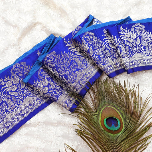 Vintage Banarasi Silk Border Trim 1 Yard Royal Blue Silver Zari Ribbon Recycled Saree Fabric Lace for Sewing, Dressmaking Christmas Decor
