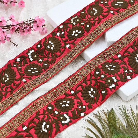 Indian Vintage Magenta & Red Sari Border 1Yd Hand Embroidered Dabka Lace Trim Sewing Craft Ribbon Dress Decor