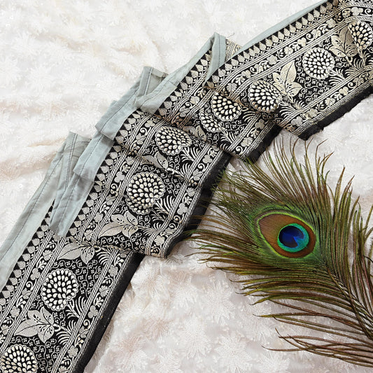 Vintage Banarasi Silk Border Trim 1 Yard Black Silver Zari Floral Ribbon Recycled Saree Lace for Sewing, Home Decor & Christmas Crafts