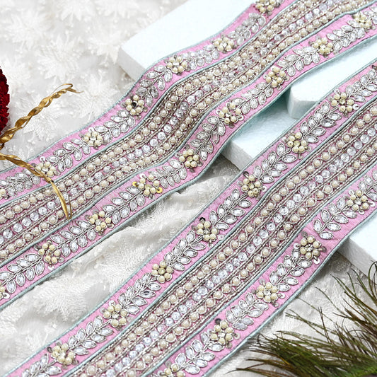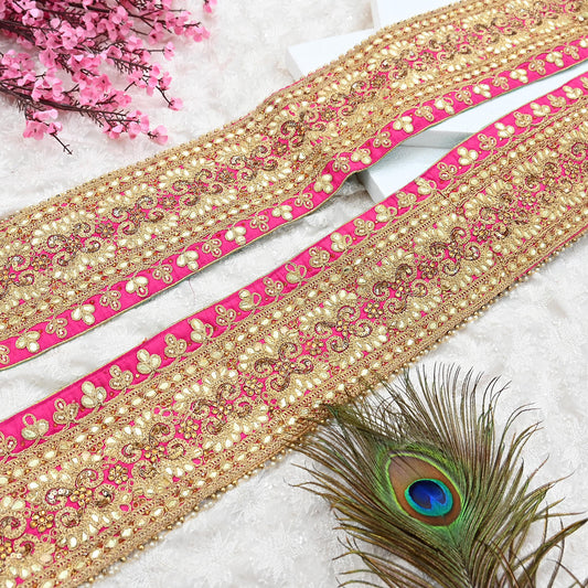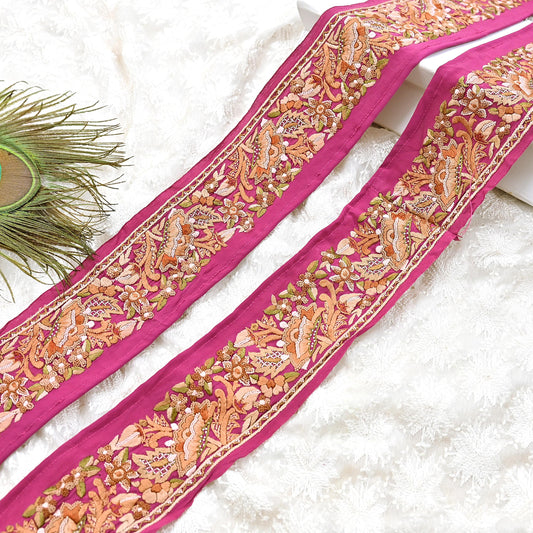 Indian Vintage Pink Sari Border 1Yd Hand Embroidered Dabka Lace Trim Sewing Craft Ribbon Dress Decor