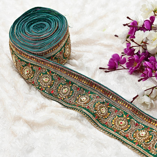 Indian Vintage Green Sari Border 1Yd Hand Embroidered Dabka Lace Trim Sewing Craft Ribbon Dress Decor