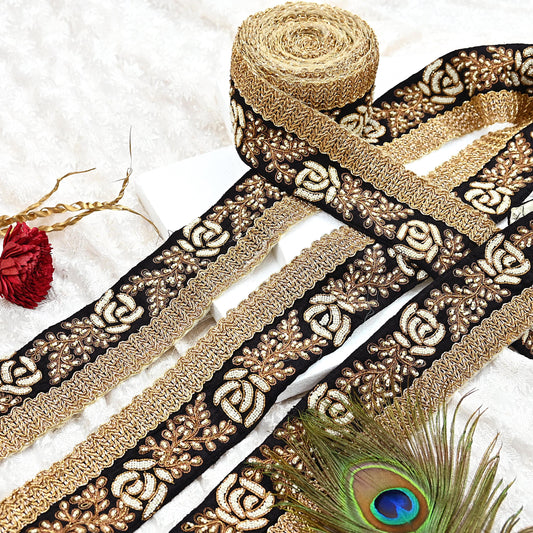 Indian Vintage Black Sari Border 1Yd Hand Embroidered Dabka Lace Trim Sewing Craft Ribbon Dress Decor
