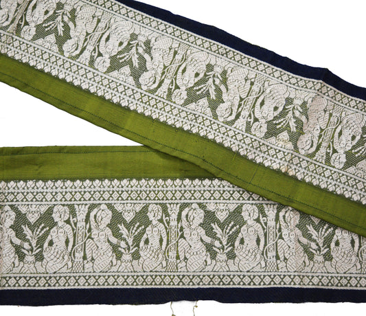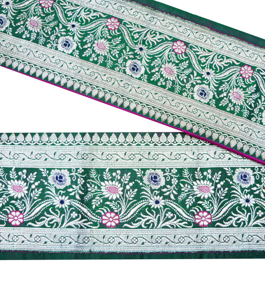 Indian Vintage Sari Border Green Woven Banarasi Brocade Trim Craft Sewing Recycled Sari Border Silver Zari Satin Silk Home Decor Crafting
