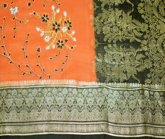 Vintage Black & Orange Pure Silk Hand Woven Design Fabric Golden Zari Indian Fabric Craft 40"X44" Floral Design Soft Fabric