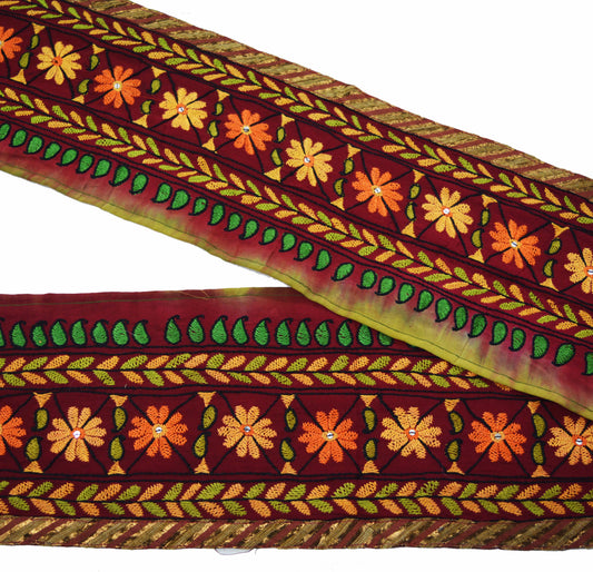 Indian Vintage Maroon Sari Border Kantha Hand Embroidered Sari Border Indian Craft Trim Lace Sewing Sari Ribbon Recycled Decor Floral