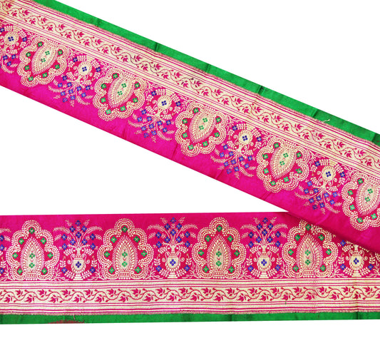 Indian Vintage Sari Border Pink Woven Banarasi Brocade Trim Craft Sewing Recycled Sari Border Golden Zari Satin Silk Home Decor Crafting