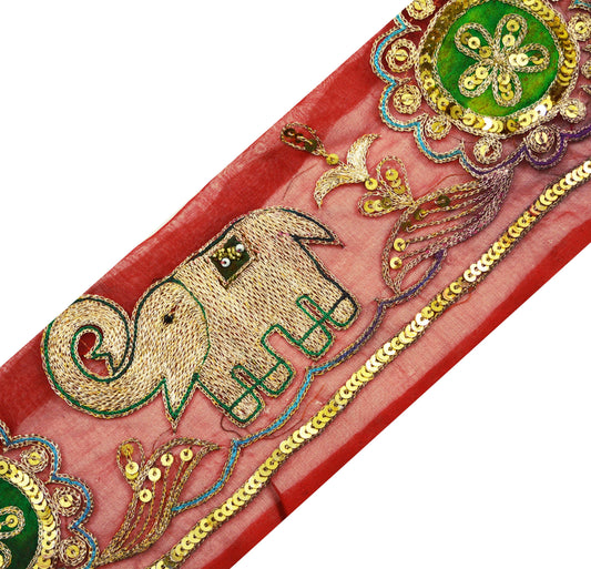 Indian Vintage Red Sari Border Hand Embroidered Ari Work Indian Craft Trim Lace Sewing American Georgette Ribbon Recycled Sari Border Zari