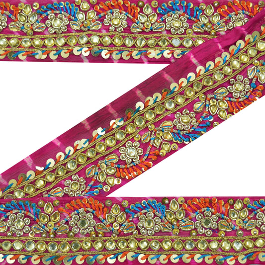 Indian Vintage Pink Sari Border Pure Chiffon Silk Hand Embroidered Indian Craft Trim Lace Sewing Sari Ribbon Recycled Dress making Zardozi