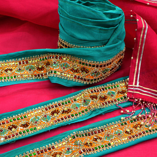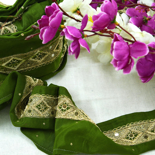 Indian Vintage Henna Green Sari Border Hand Embroidered Indian Craft Trim Lace Sewing Sari Ribbon Pure Crepe silk Zardozi/Dabka Zari