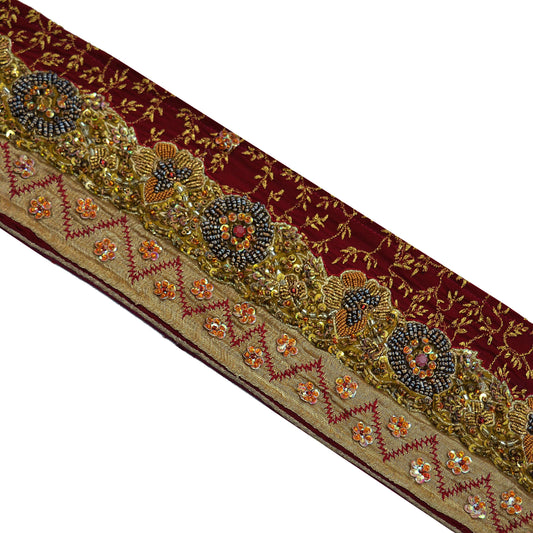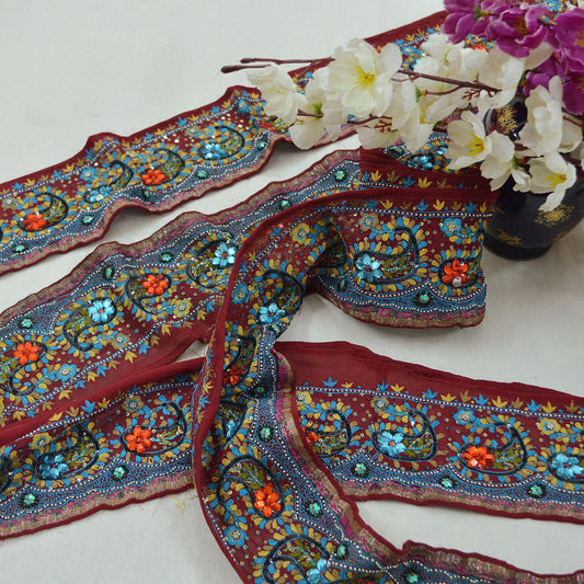 Indian Vintage Maroon Sari Border Hand Embroidered Indian Craft Trim Lace Sewing Pure Georgette Silk Ribbon Recycled Sari Border Zardozi