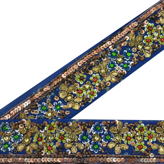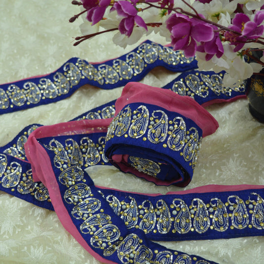 Indian Vintage Royal Blue Sari Border Hand Embroidered Craft Trim Lace Sewing Sari Ribbon Pure Crepe silk Zardozi/Dabka Zari