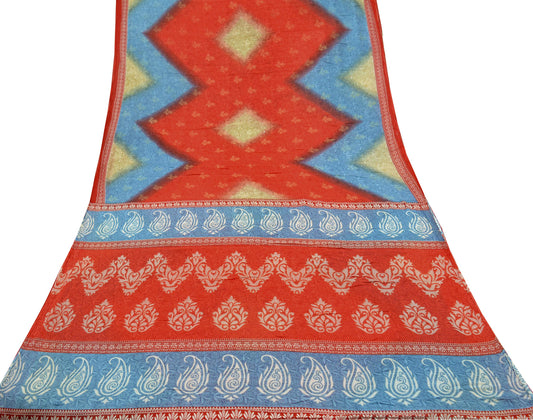 Indian Vintage Sari Blue & Red Printed Pure Cotton Sarees Craft Fabric Soft 5Yd Sewing Sarong Wrap Boho Dress making Quilting Crafting