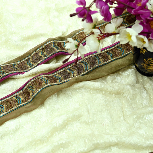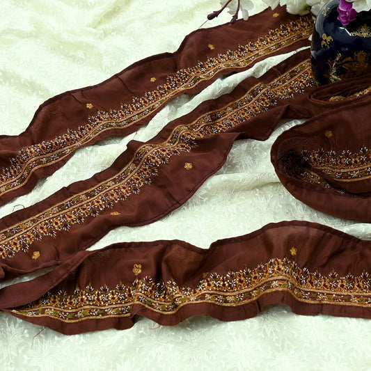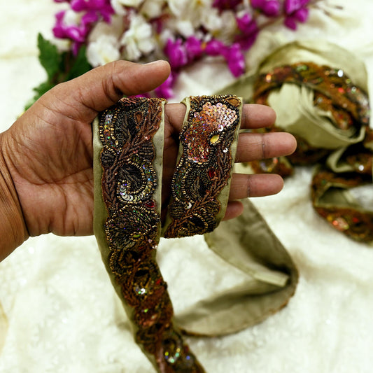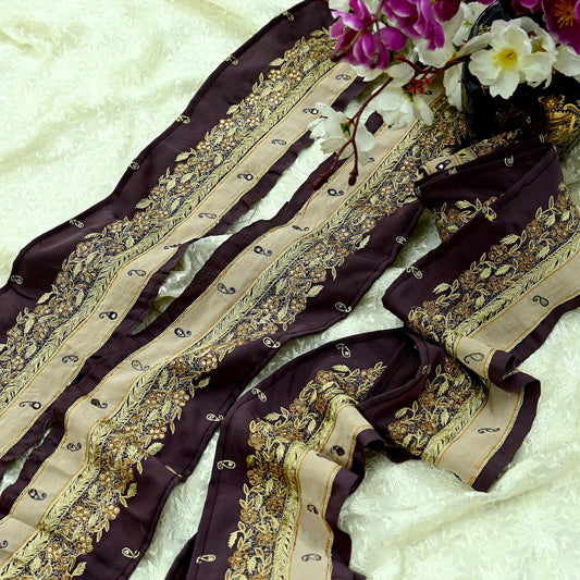 Indian Vintage Brown Border Hand Embroidered 1Yd Craft Trim Lace Sewing Sari Ribbon Crepe Zari Mirror Decor Gift Wrapped Paisley