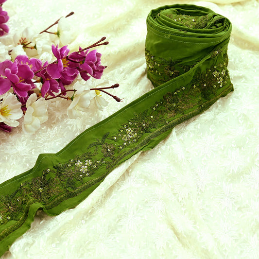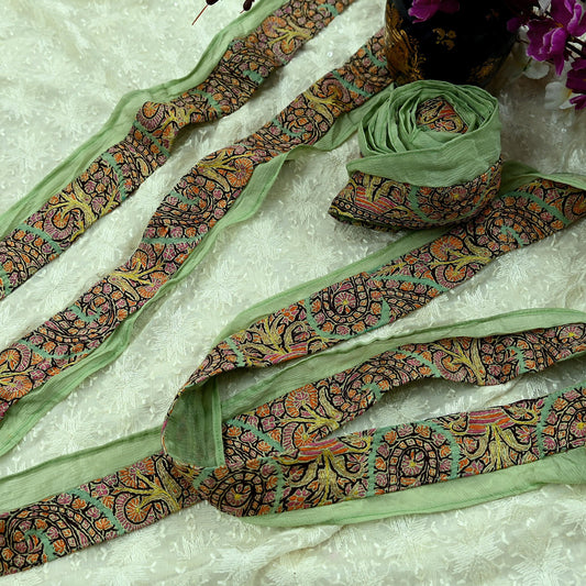 Indian Vintage Green Border Pure Crepe Silk Hand Embroidered Indian Craft Trim Lace Sewing Sari Ribbon Recycled Decor Gift Wrapped