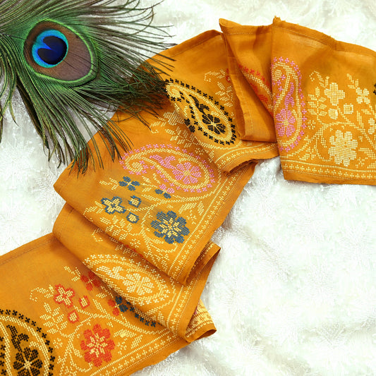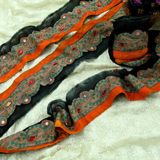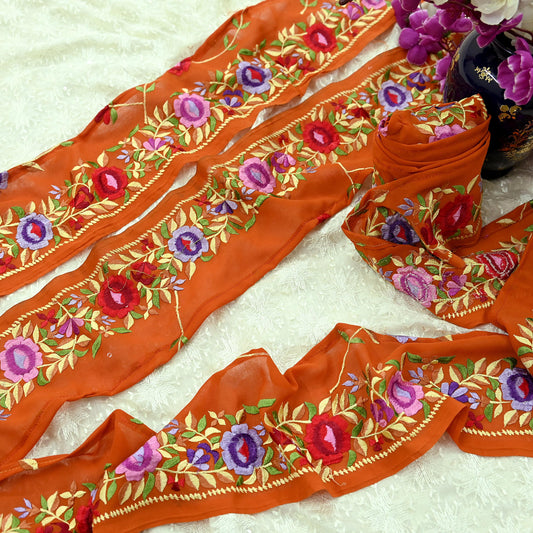 Indian Vintage Orange Border Pure Georgette Silk Hand Embroidered 1Yd Craft Trim Lace Sewing Sari Ribbon Recycled