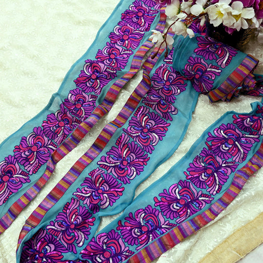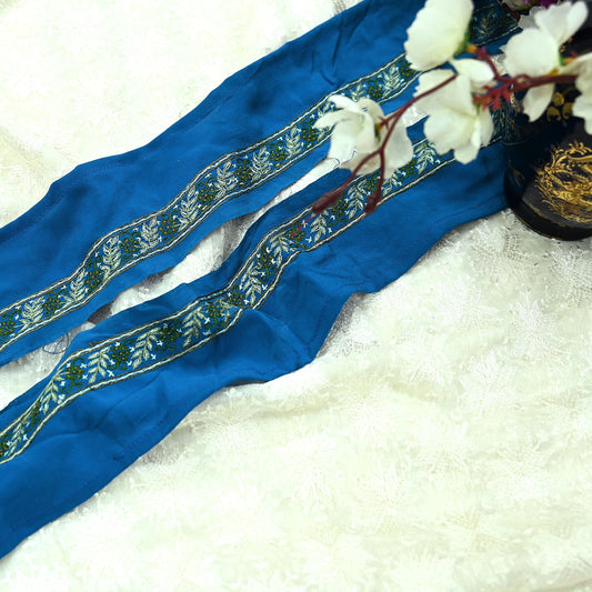 Indian Vintage Blue Border Pure Chiffon Silk Hand Embroidered 1Yd Craft Trim Lace Sewing Sari Ribbon Recycled Dress making Zardozi