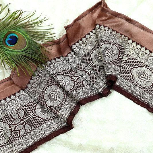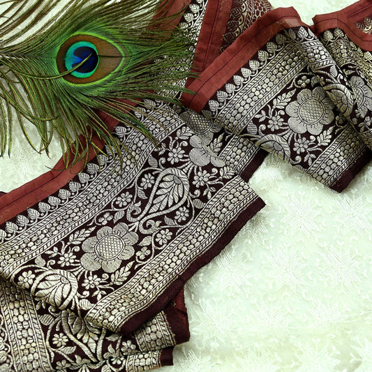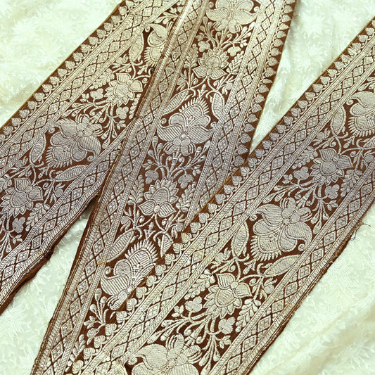 Indian Vintage Brown Sari Border Woven Banarasi 1yd Trim Craft Sewing Recycled Sari Border Golden Zari Pure Silk Home Decor Crafting