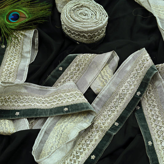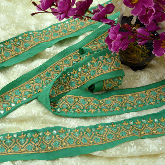 Indian Vintage Green Sari Border Hand Embroidered Indian Craft Trim Lace Sewing Sari Ribbon Pure Crepe silk Zardozi/Dabka Zari