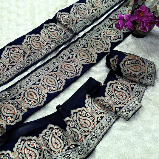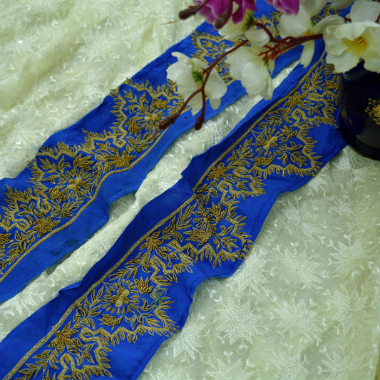 Indian Vintage Blue Sari Border Hand Embroidered 1yd Craft Trim Lace Sewing Sari Ribbon Pure Crepe silk Zardozi/Dabka Zari