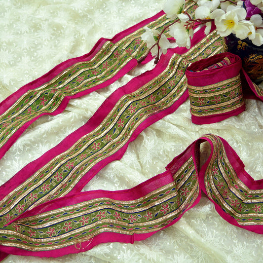Indian Vintage Pink Saree Border Hand Embroidered Gota Patti 1yd Craft Trim Lace Sewing Sari Ribbon Pure silk