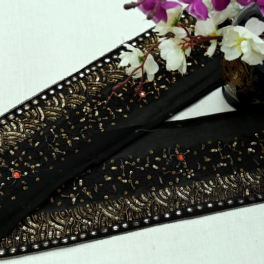 Indian Vintage Black Saree Border Hand Embroidered Craft Trim 1Yd Lace Sewing Pure Georgette Silk Ribbon Recycled Sequins
