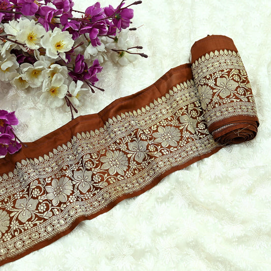 Indian Vintage Brown Sari Border Woven Banarasi 1yd Trim Craft Sewing Recycled Sari Border Golden Zari Pure Silk Home Decor Crafting
