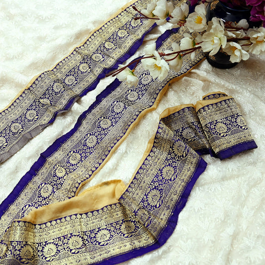 Indian Vintage Saree Border Blue Woven Banarasi Brocade Trim Craft Sewing Recycled Sari Border Golden Zari Pure Silk Home Decor Crafting