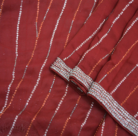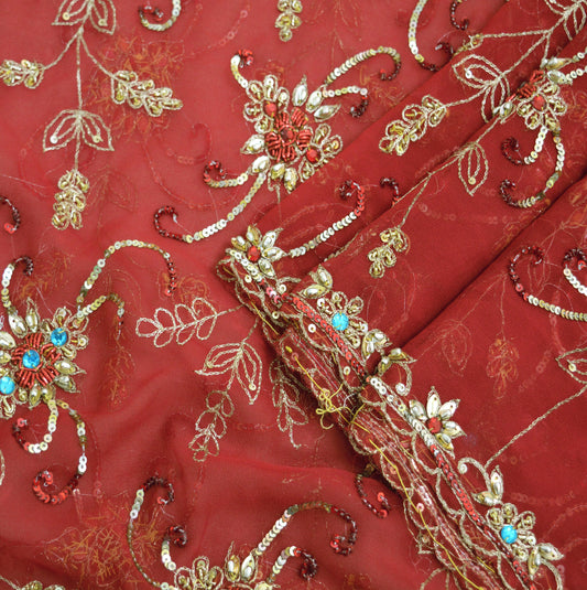 Indian Vintage Heavy Red Dupatta Pure Georgette Silk Long Stole Hand Embroidered Scarves Glass Beaded