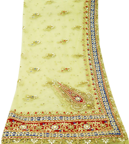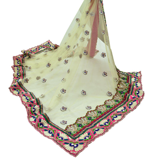 Indian Vintage Heavy Ivory Dupatta Net Mesh Long Stole Hand Embroidered Scarves Golden Zardozi Dabka Zari Stole