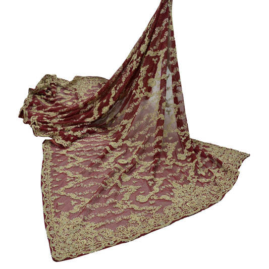 Indian Vintage Heavy Bridal Maroon Dupatta Net Mesh Long Stole Hand Embroidered Scarves Golden Zardozi Zari Sequins wedding Veil Hijab