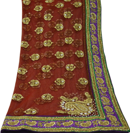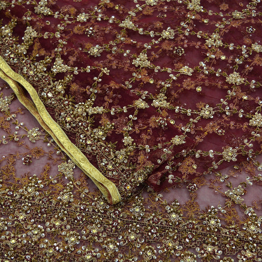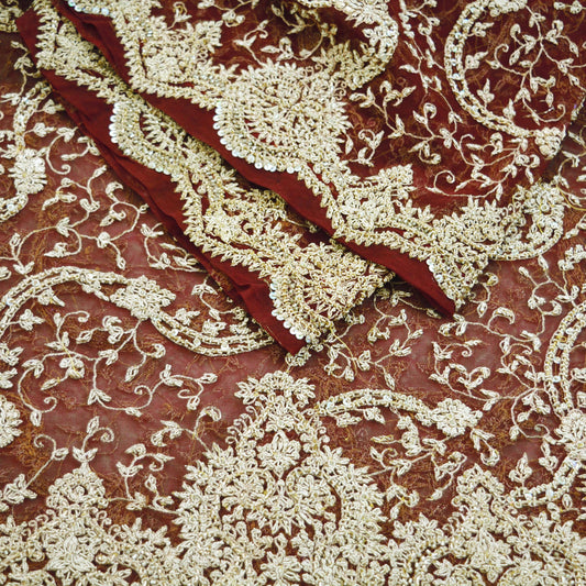 Indian Vintage Heavy Maroon Dupatta Net Mesh Long Stole Hand Embroidered Scarves Golden Zardozi Zari Sequins Stole