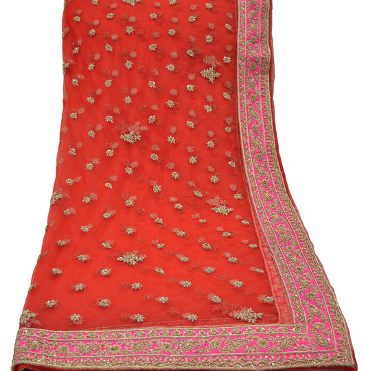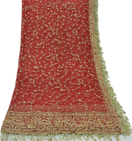 Indian Vintage Heavy Red Dupatta Net Mesh Long Stole Hand Embroidered Scarf Golden Zardozi Zari Glass Beaded Stole